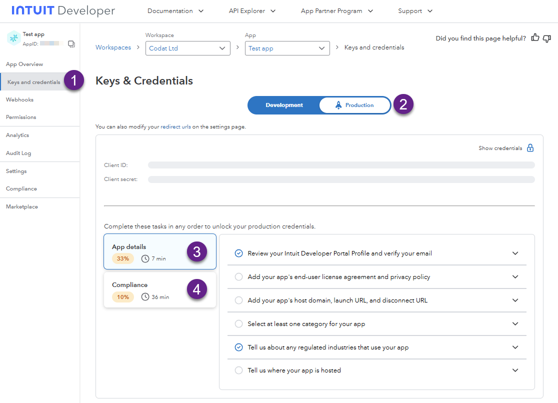 To access the questionnaire, navigate to Keys and credentials in your app's detailed view and toggle the environment to Production. Provide general app details in App details, then switch to the Compliance tab and click Start questionnaire.
